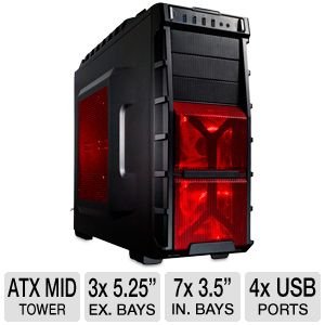 XION XON-980-BK ATX Mid Tower. Color : Black with RED LED Light. Case material : Steel/ Plastic, Meshed Front Panel design. Power Supply : not included. Power Supply mounted : Bottom. Motherboard Compatibility : E-ATX/ATX/Micro ATX. External 5.25-Inch Drive Bay : 3 with Anti-vibration rubber-pads. Internal 3.5-Inch (2.5-Inch SSD) HDD Bays: 7 with Pull-Out cages. PCI Slots : 7. Front Ports : USB3.0 x2,USB2.0X2, 7.1 Channel Audio x 2. Cooling system : Front, 2 X 120mm RED LED Fan with Filters (included) ,Rear, 1 X 120mm (included), Side , 2X 120mm Fan (Optional) or (1*220mm Fan, Optional ), TOP : 2 x 120mm (or 2x140mm) (Optional) for Dual Radiators liquid cooling. Case Dimensions : 21.8-Inch x8.3-Inchx 20.5-Inch (555 x 210 x 520 mm) (HxWxD). Package Dimension : 25-Inch x 11-Inch x 22-Inch (HxWXD). Weight : 19.5 Lbs (8.4 Kg). VGA Clearance maximum : 13.4-Inch (340mm). CPU Heatsink Support : 6.5-Inch (165mm)